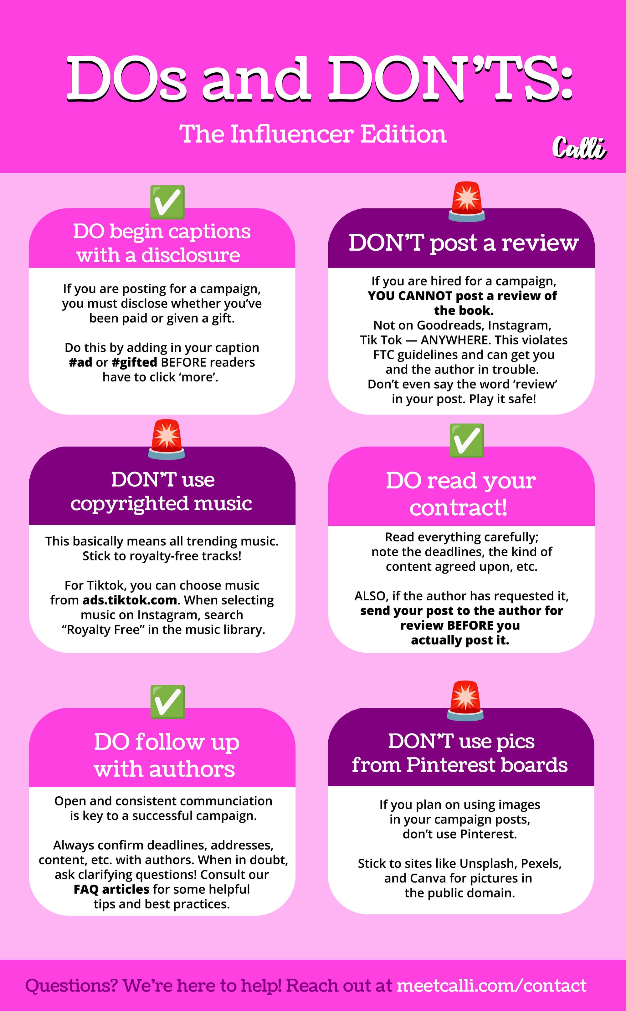 Christina here — if you're new to Calli, welcome, and if you've been here a while we hope any campaigns you're working on at the moment are going smoothly. We have some extremely important reminders we want to go over with you, so take the time to check out the following Dos and Don'ts: